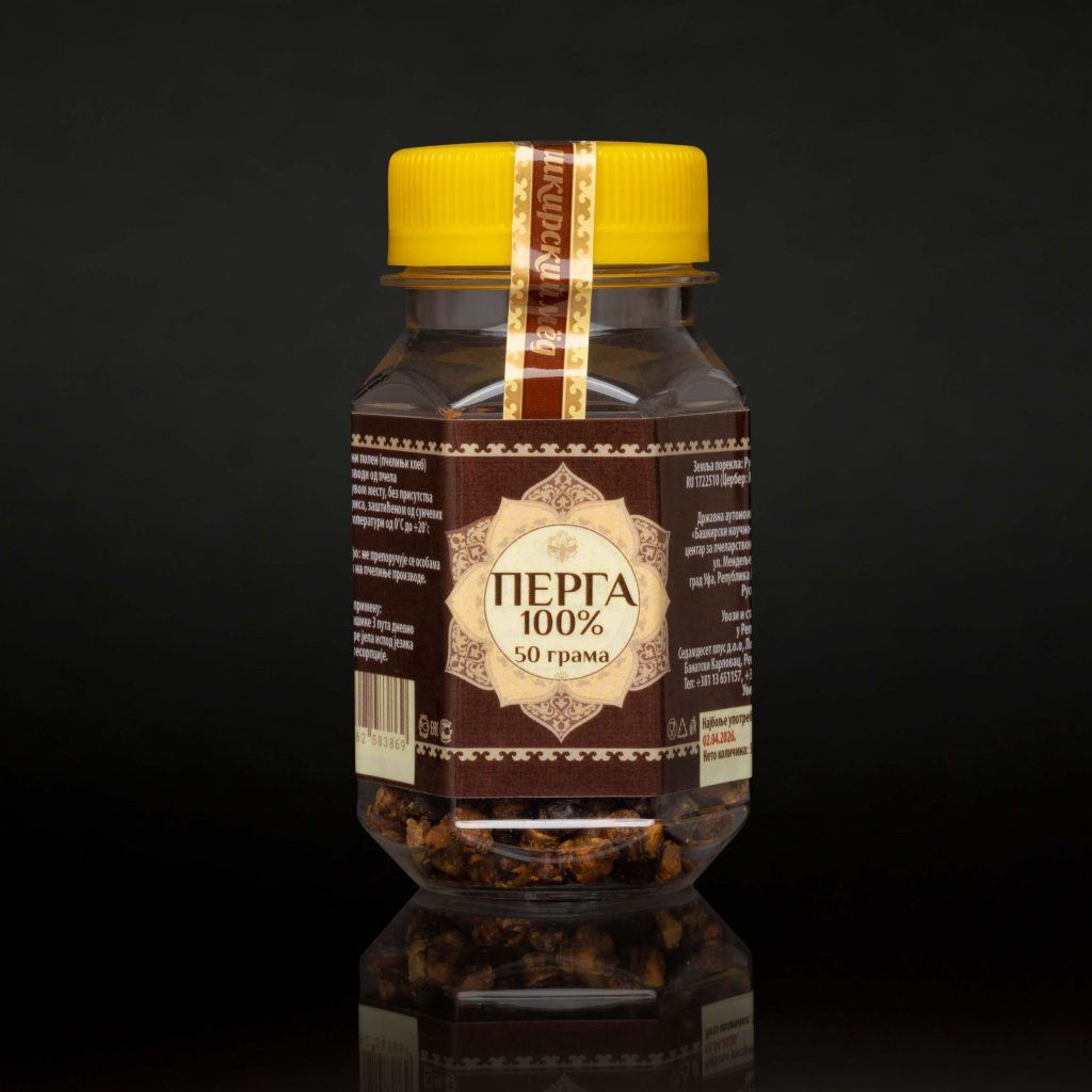 Naša Perga potiče sa predela na kojima se smenjuju ruske tajge i stepe bogate raznovrsnim biljnim svetom, a proizvode je , uz pomoć pčela, naučni radnici Državne ustanove “ Baskirski naučno-istraživački centar za pčelarstvo i apiterapiju “ iz grada Ufa – Rusija.